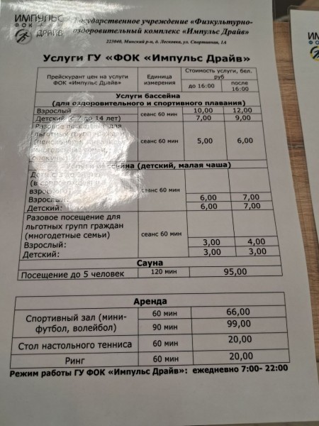 ФОК в Лесковке на сегодня предлагает услуги: плавательного бассейна, сауна, зал игровых видов спорта, бокса, тренажерного зала, фитнес.